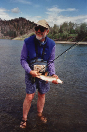 Wilbur fly fishing with guide Rock Ringling and oarsman Doug Mitchell, Summer 2000 on the Missouri River.