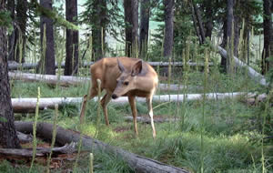 Big Horn Sheep standing above tent and staring at wilderness campers